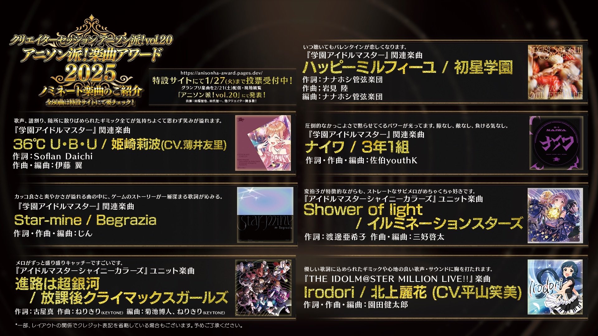 『アニソン派!楽曲アワード2025』アイマス関連曲複数ノミネート