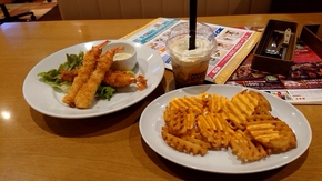 今日のメニューはエビフライプレートとチーポテ、タピオカドリンク。