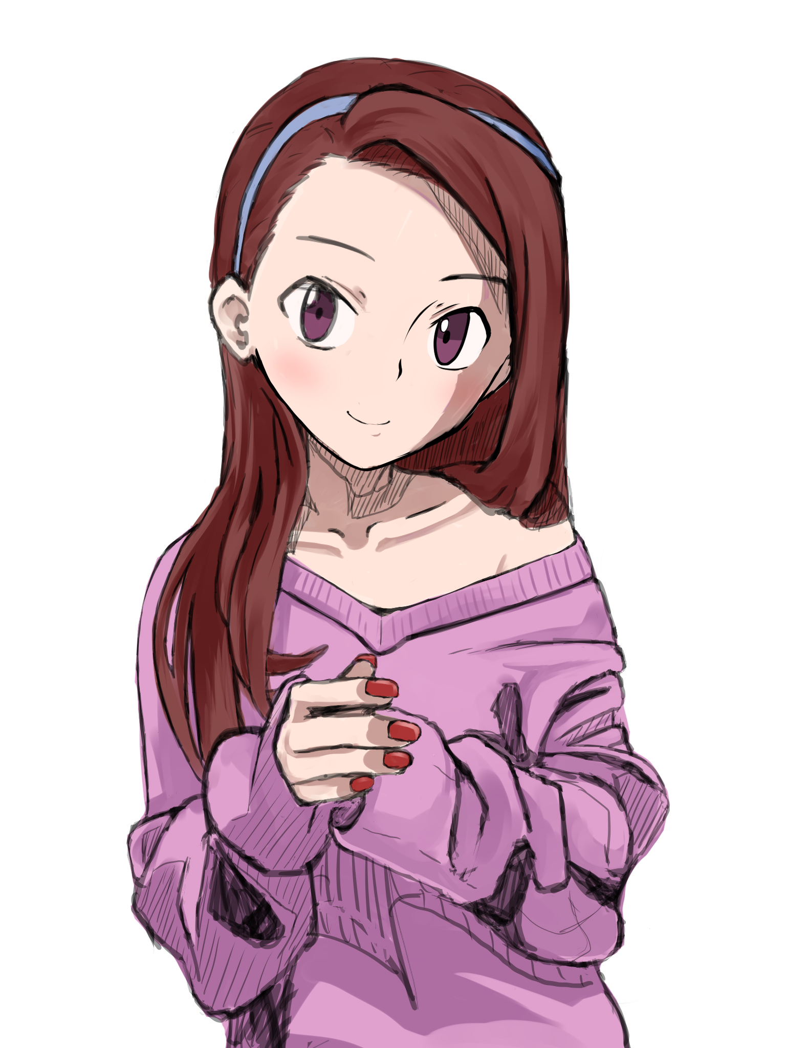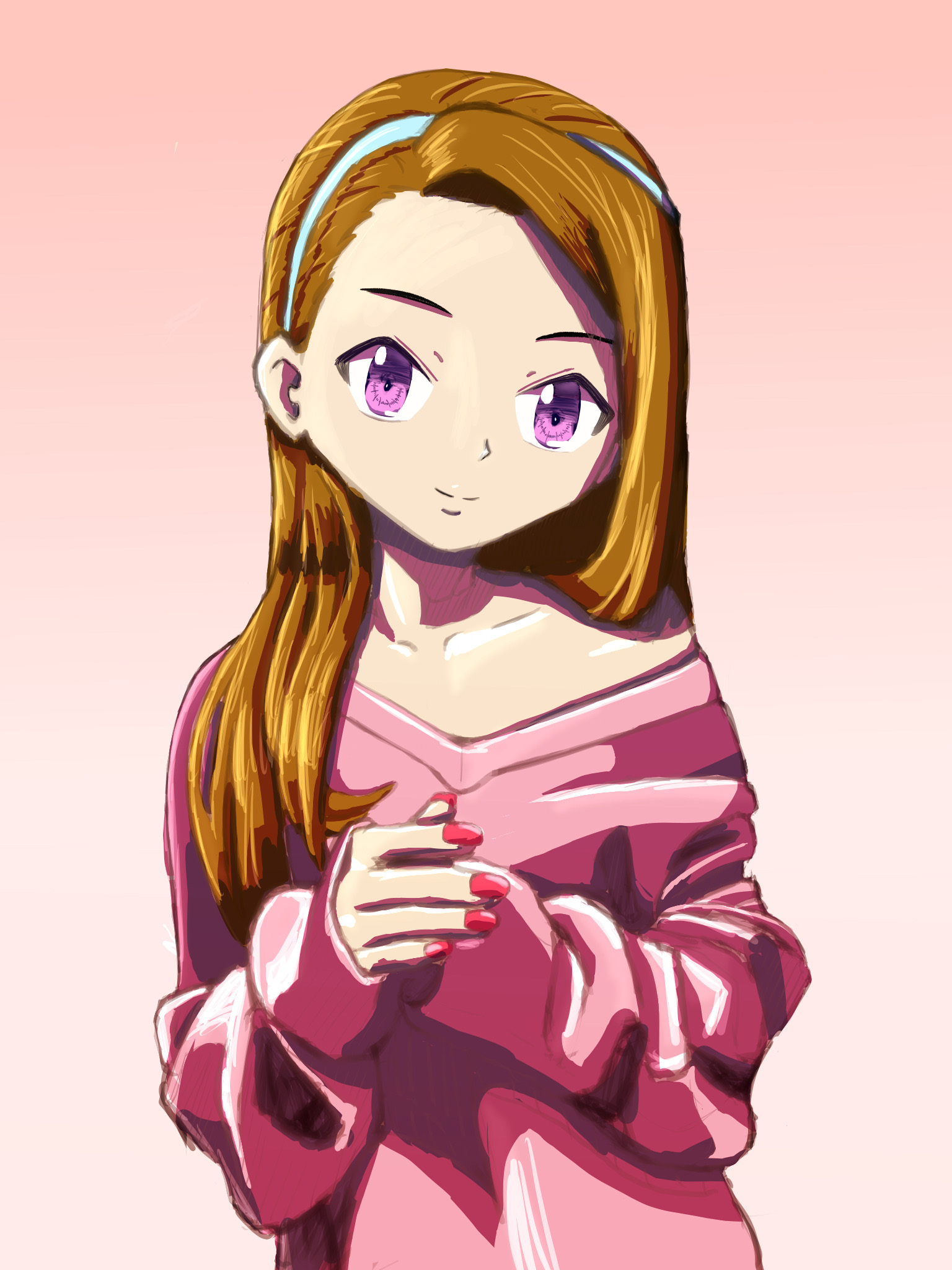 女性らしさが出やすい胸から肩周りと髪の部分にハイライトとかの描きこみ増やしてツルツル感出して、それ以外の服とかの白いハイライトを減らしてザックリにしてみた