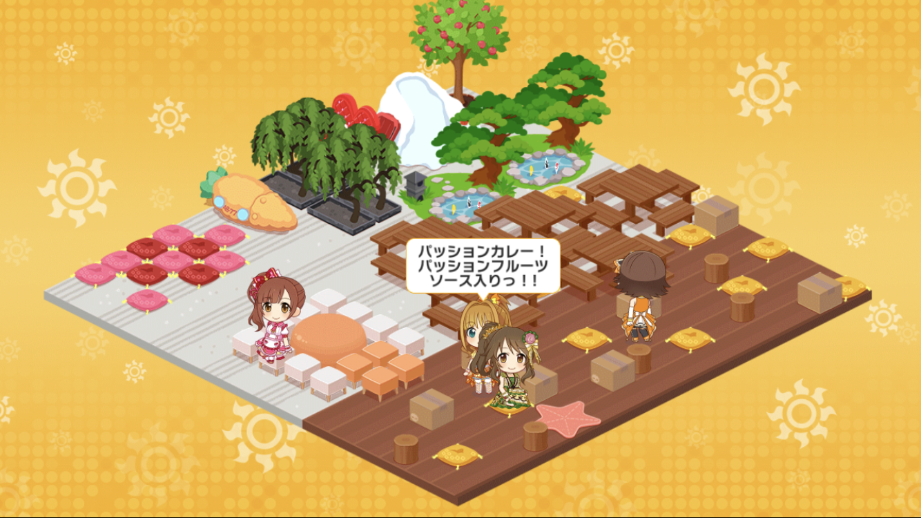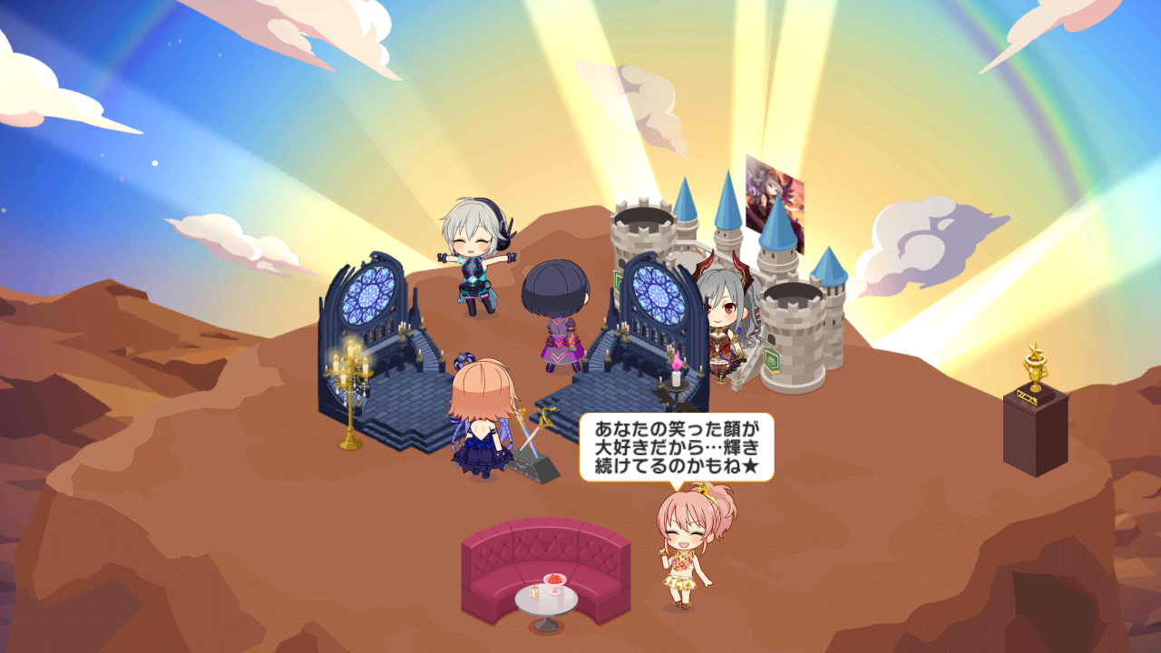このルーム機能って最初はオマケ程度に考えてたけど、モーション豊富だし、アイドルの交流見やすいし、ネタ性も高いと魅力いっぱいなんだよね。新しく手に入れたアイドルをルームで眺めているだけで十分面白いという