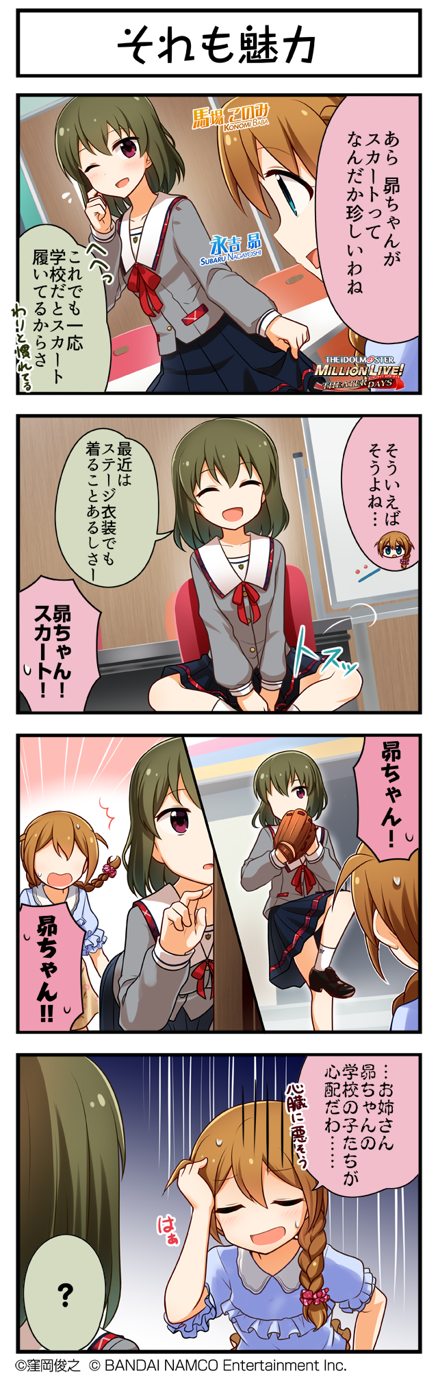 昴は下に短パンとかはいてて学校の男子相手だと「はいてるから大丈夫」って言ってるんだけどそれと同じ服装でもプロデューサーの前だとついスカートを押さえたりプロデューサーが来ると
