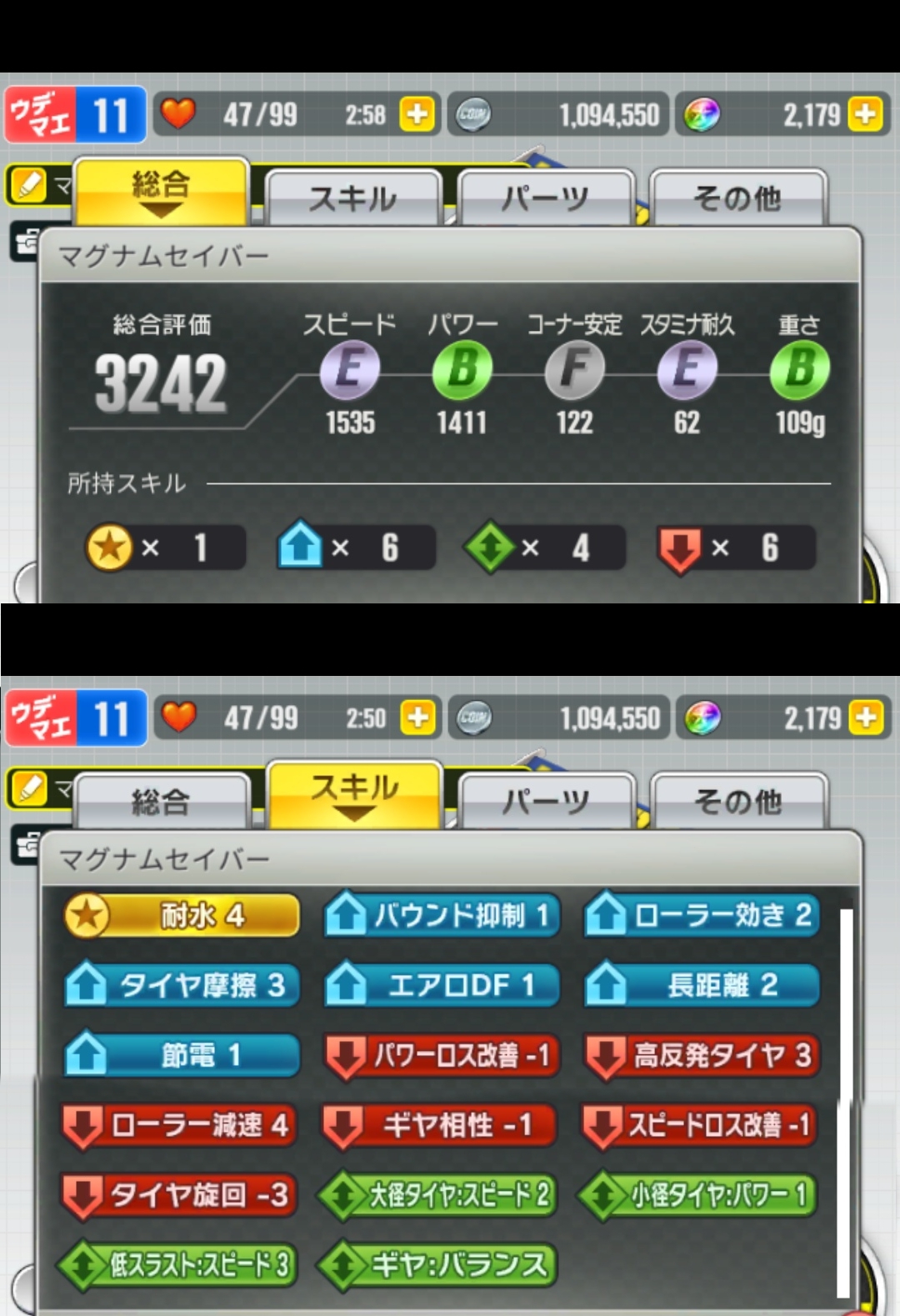 勝ったマシンのステとスキルです