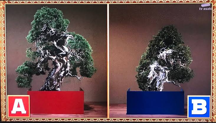億超えの盆栽と、菓子職人が本物そっくりに作った盆栽の形した菓子細工だけど、遠目からじゃ区別できんよ