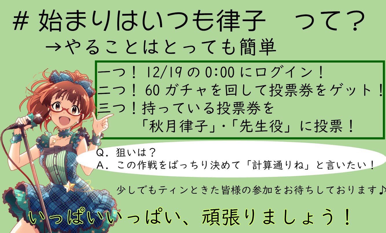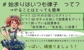かつて公式の手でドン底迄叩き落とされた律子Pが今律子の為に全力で戦ってると思うと…必ず一斉投票は支援させて貰う