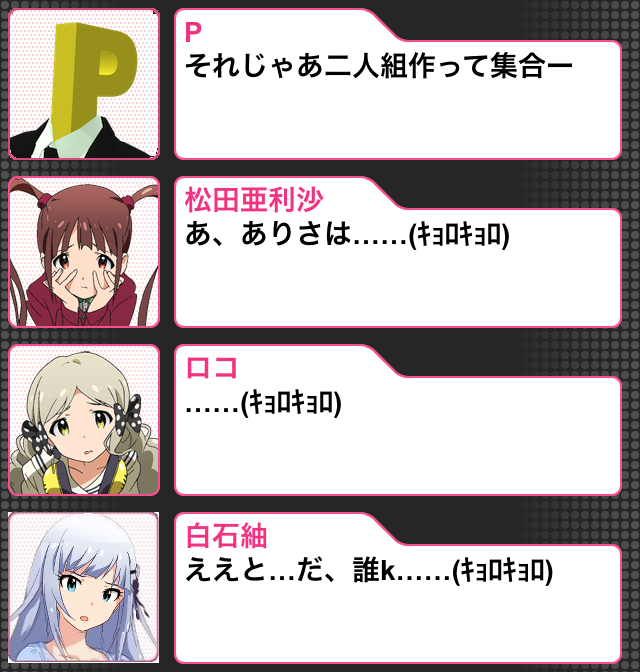 伝え聞くグリ時空の話も専らPといちゃつく話だし、こっちでも成人組とは満遍なく仲よさそうではあるけど他の子みたいに「ふう〇〇」や「〇〇ふう」的なものは聞かないなって(ふうかおはPを含めた要は三角関係なのでちょっと)