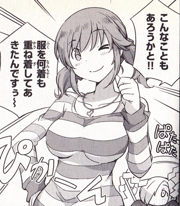 上下下着、靴、靴下、スカート、シャツ、上着で最低9枚くらいは着てるか…?